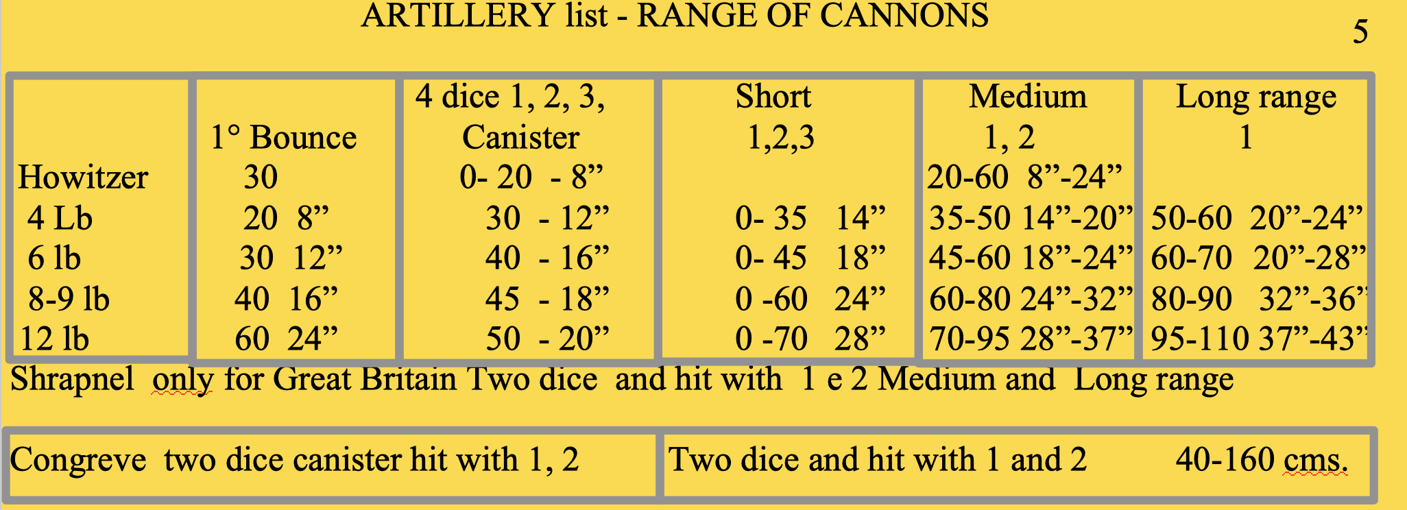 SHRAPNEL for British Artillery only is a type of bullet used by British artillery to achieve a canister effect at a distance. Being a bullet can be fired from barrels of different caliber and the range varies depending on the cannon used. Each battery rolls two dice that will cause a loss with 1 and 2 from the second sector until the end of the maximum flow rate. With a reduced battery (one or two real cannons) rolls two dice with a -1 penalty (causes a loss only with 1). Do not overrides the protections. It can shoot at troops in open order, but they roll the saving throw dice.