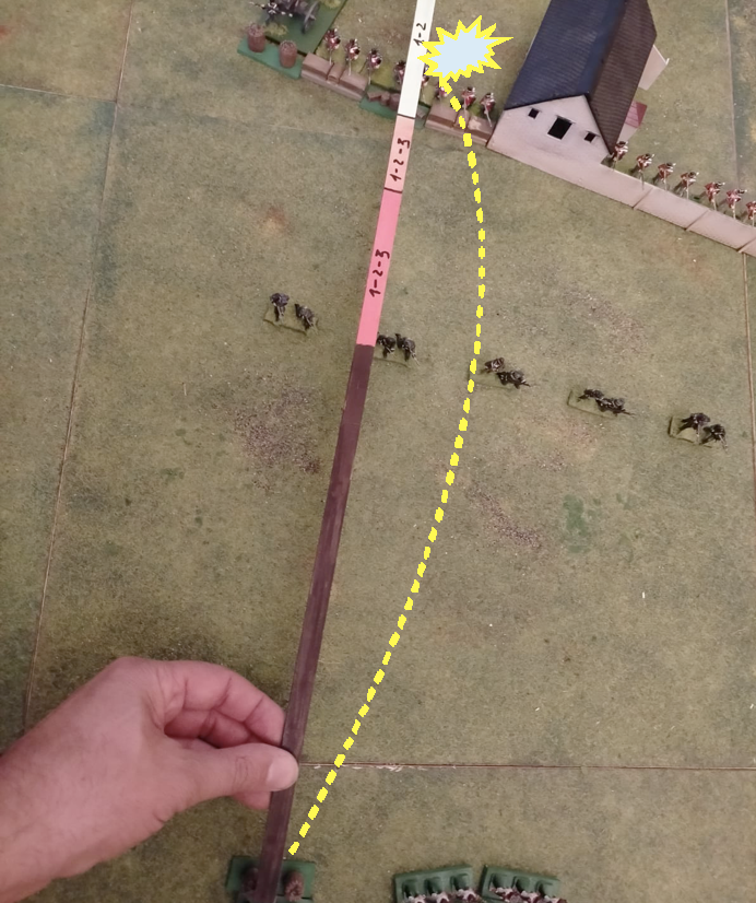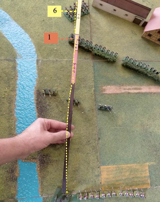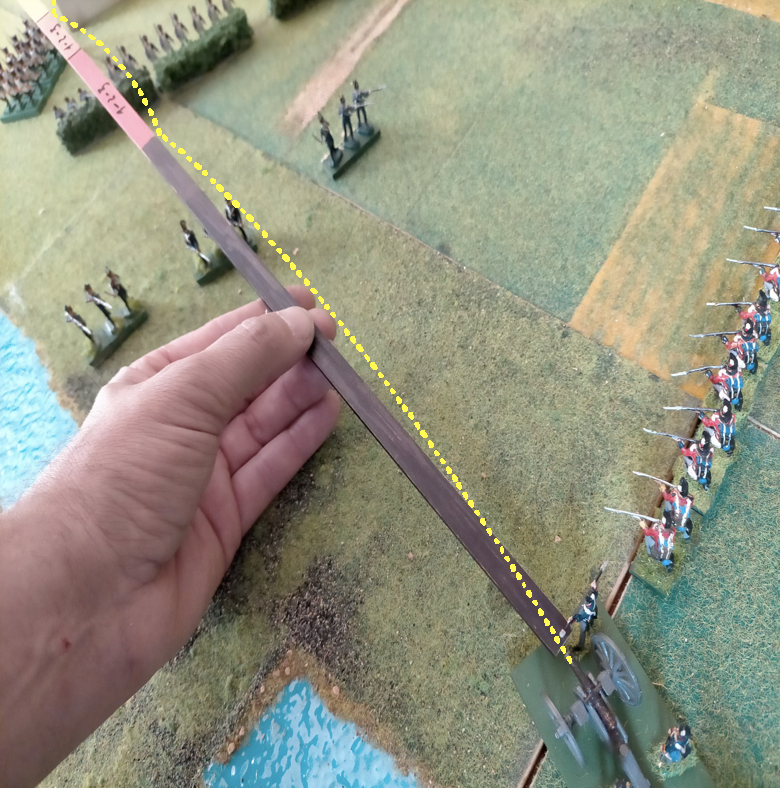 Tis is the most common and important aiming of the period. At 0 rise, the ball fired by the cannon would bounce several times at human height until the end of the range. To calculate the losses caused on the enemy you roll as many six-sided dice as there are soldiers crossed by the rod. For every 1, 2 and 3 in the near sector, 1 and 2 at medium distance and 1 in the long one, a soldier is eliminated. If the same unit falls simultaneously in two sectors, the closest one always prevails.