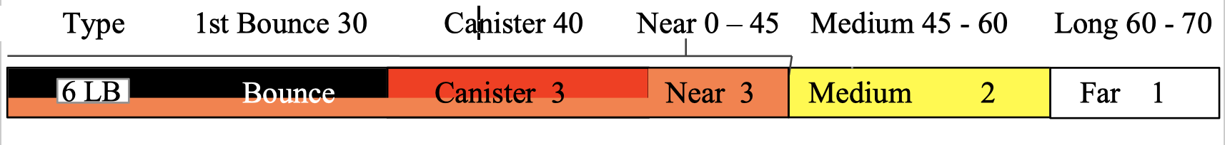 To simplify the game, for each type of gauge, we prepares a wooden bar, as long as the maximum range, with reported sectors (First Bounce-Canister-Near-Medium-Far) and the corresponding result of the dice necessary to hit the target. Depending on the type of shot or bullet used, as we will see below, you are entitled to throw more or less dice. For each dice that reaches the value required by the table, a toy soldier is eliminated.
