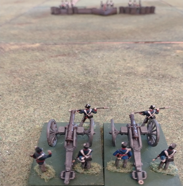 In this aiming, the Howitzer can choose two shoots (1 and 2 to hit) against the Line behind the barricade (which cannot use the saving throw) or two shots (1 and 2 to hit), against the skirmish infantry that can attempt the saving throw (for the open order) for each loss suffered, having to get 1 or 2 to save themselves.