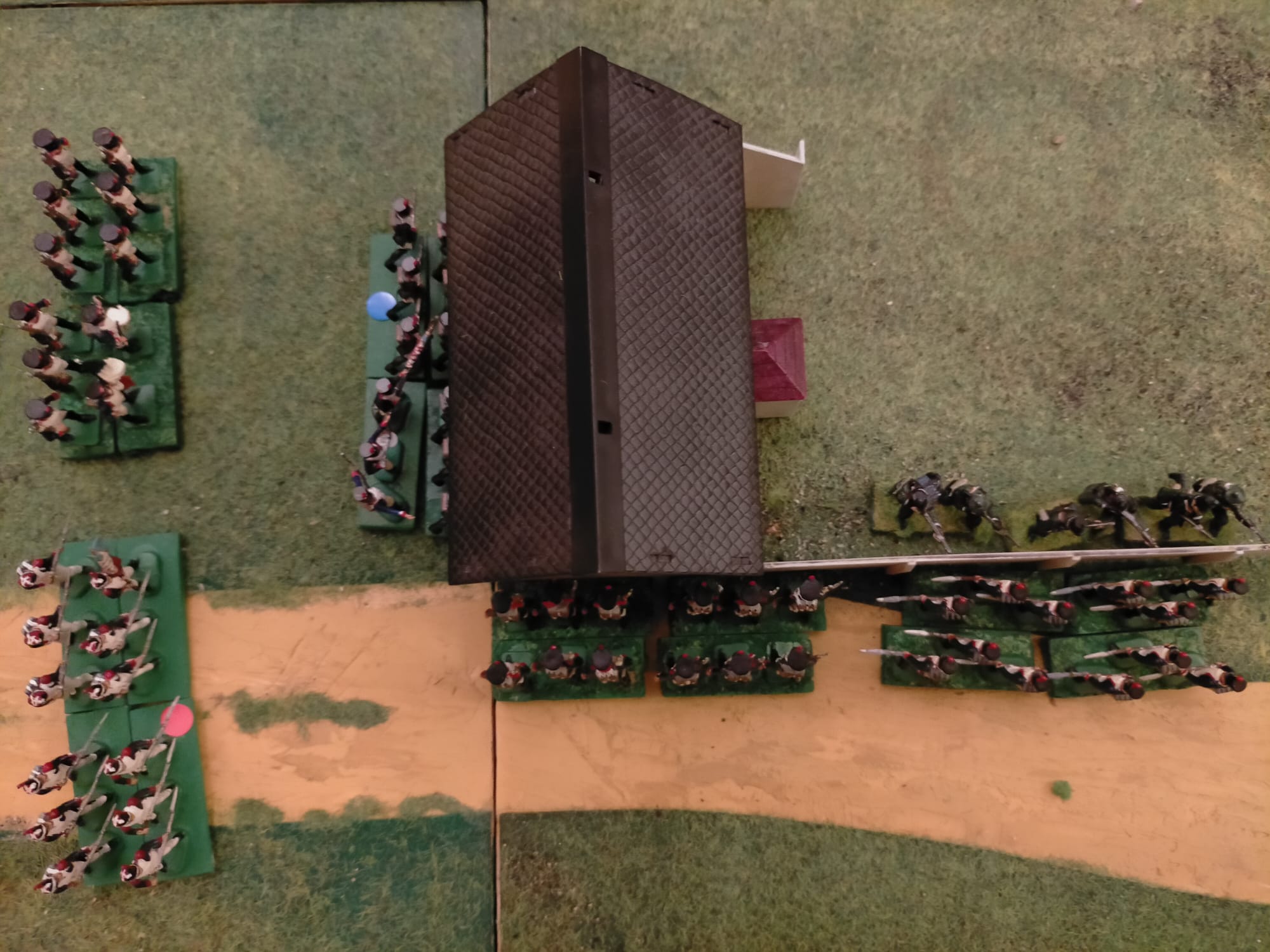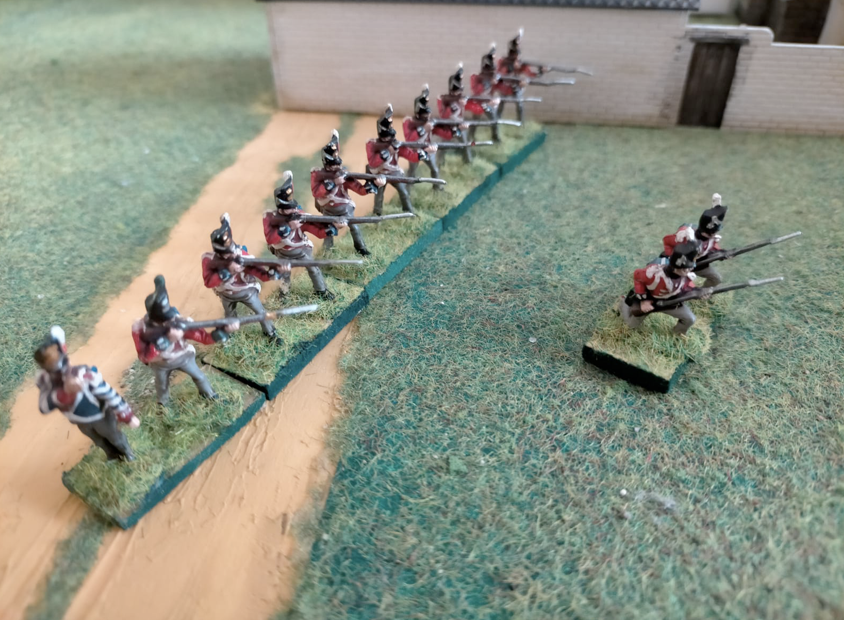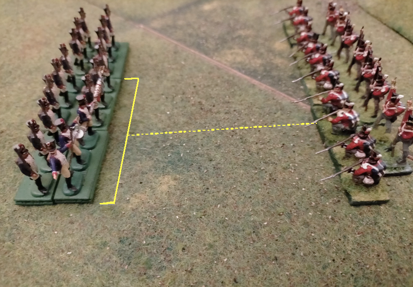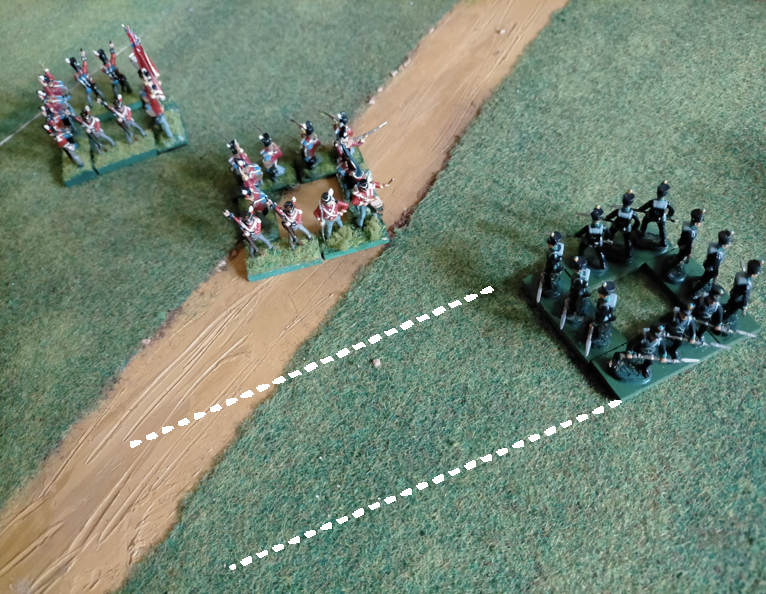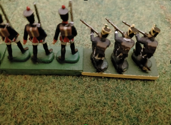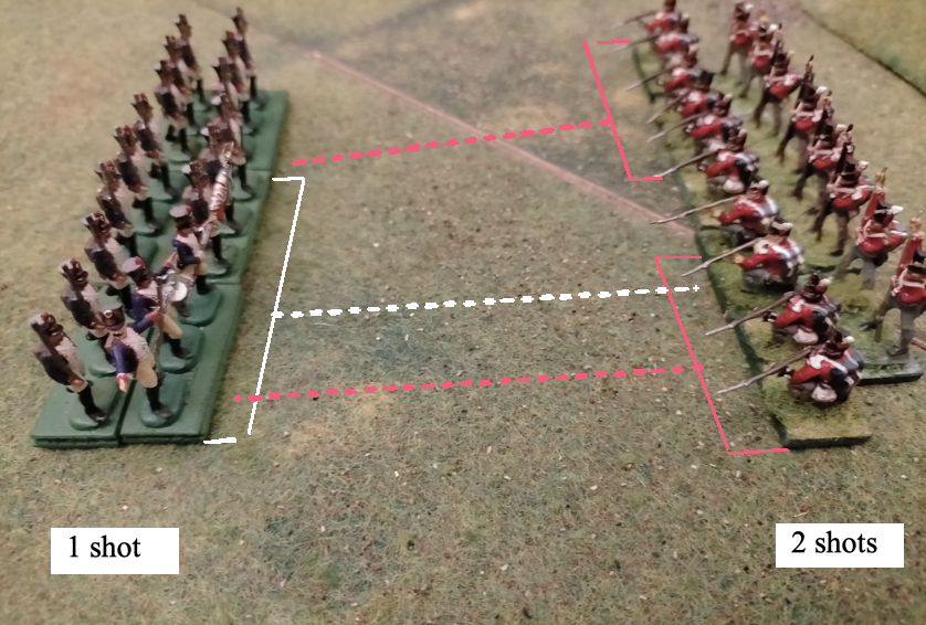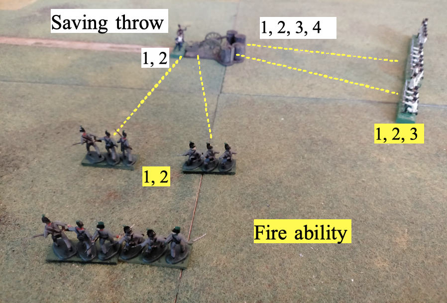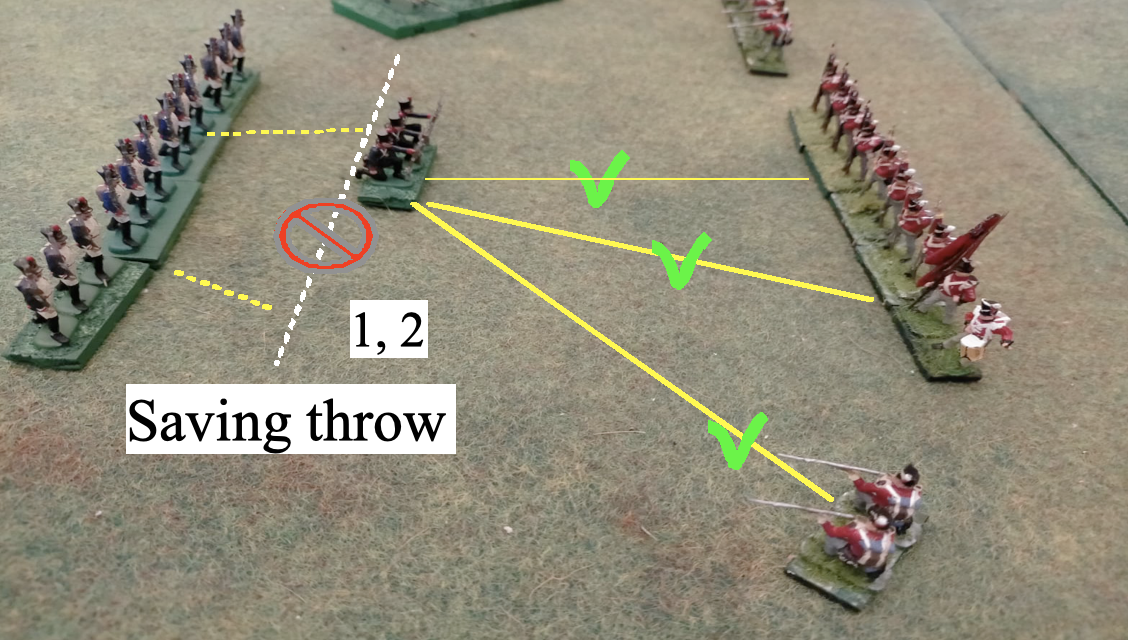 The French light company, however, is exposed to fire from both the British line and the light company despite having in its favor the "saving throw". The French line unit, on the other hand, cannot fire at the British line because it is covered by a friendly French light company.