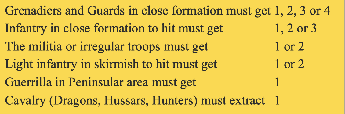 - when a battalion is composed entirely of light infantry, if it is in closed formation (line, column or square), it fights and shoots exactly like the line infantry with the same fire factor; when instead, it is placed in open order, use the expected value for light infantry. It can also keep part of the companies in closed formation and detach some or only one company of shooters chosen in order of skirmish as would a normal line battalion (in the case of the French light battalions, it is the company of the Voltigeurs). In case of danger, the skirmishers can escape behind the main battalion, ready to form a square.