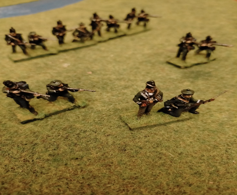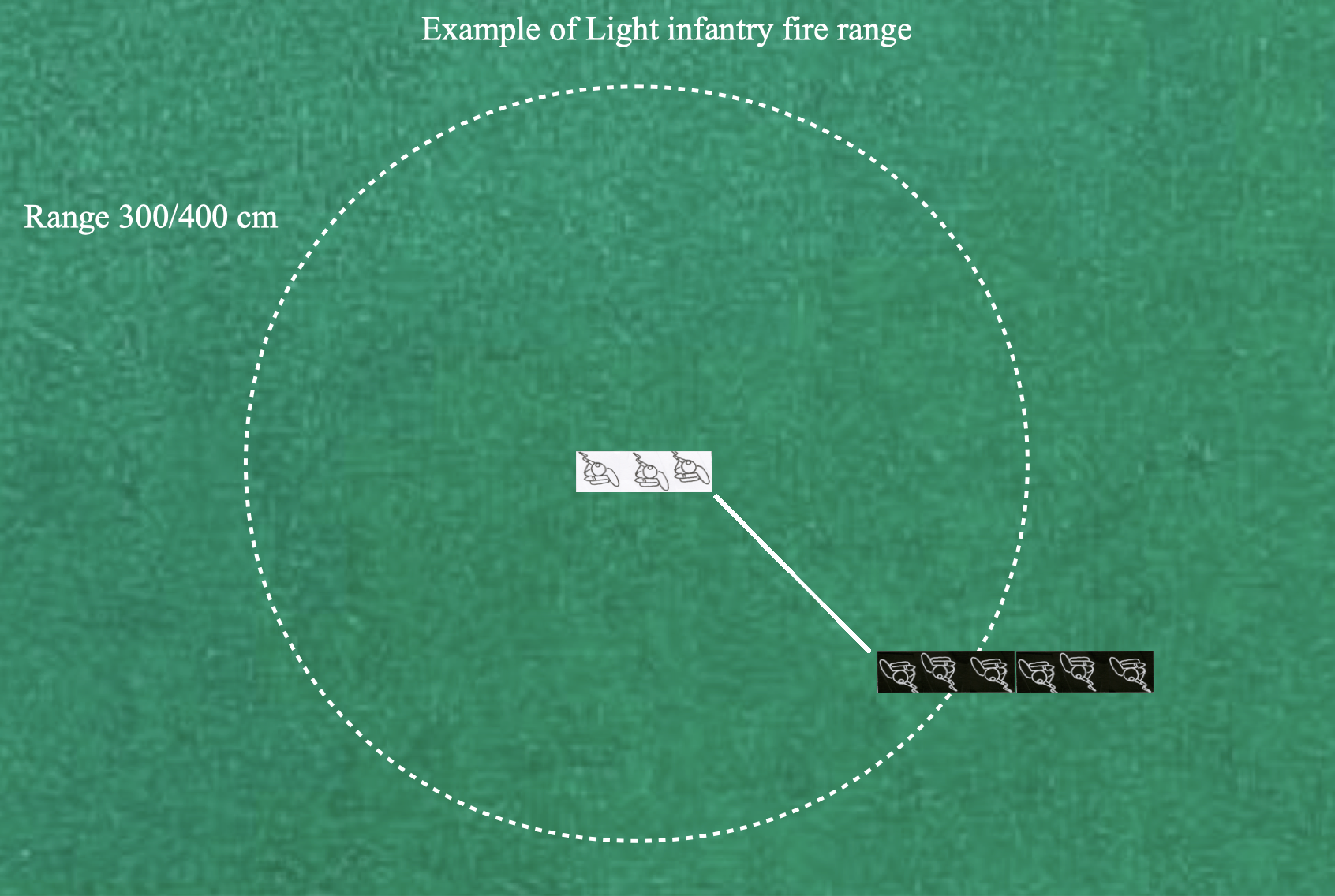 The Light infantry in skirmish has a better range and can fire in any direction around each base. It rolls one die for each base. A regular Light infantry unit's weapon has a lower range than the rifle of an elite Light infantry unit.
