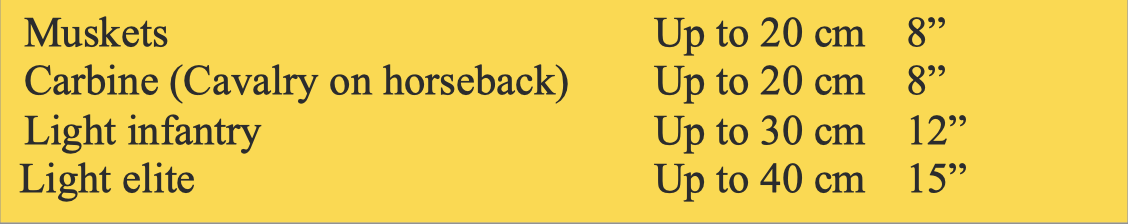 Line infantry, Light infantry, Mounted dragons, and Hussars carry small arms such as muskets, rifles, and carbines. These have different ranges as shown in the list. A regular Light infantry unit's weapon has a lower range than the rifle of an elite Light infantry unit.