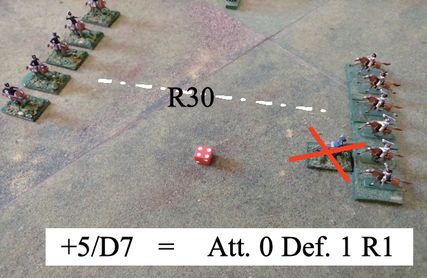 Lancers do not charge, so they only have a value of 6 points. You go to the Column corresponding to the differential (5), you throw two six-sided dice and you cross the sum of the numbers drawn on the table of the melee. It will give you the result for both the attacker and the defender. In this example the numbers drawn are 4 and 3, the sum of which gives us 7.