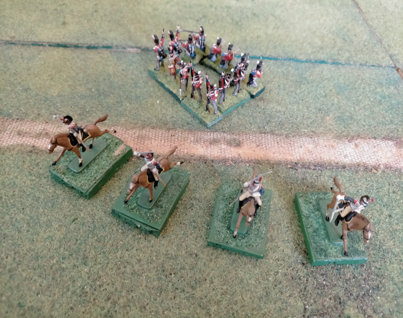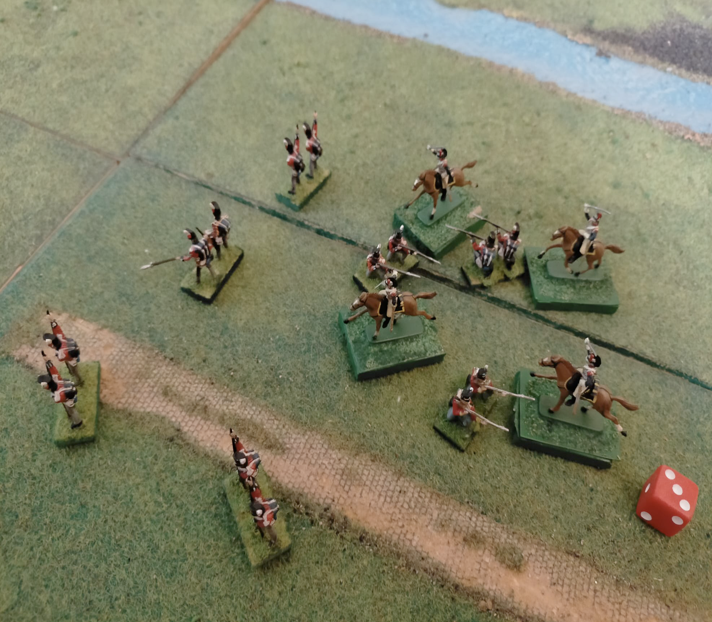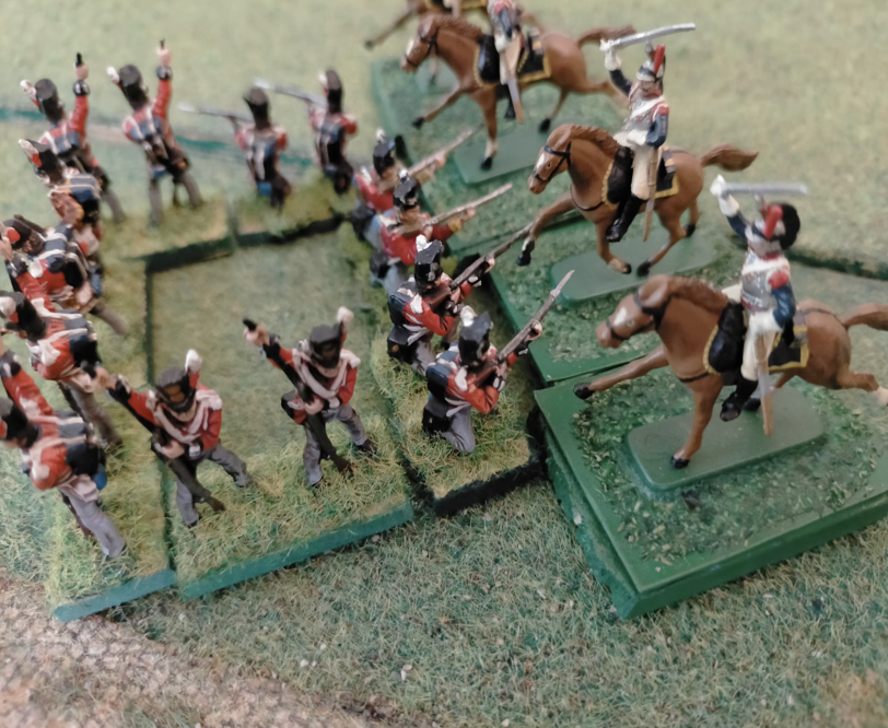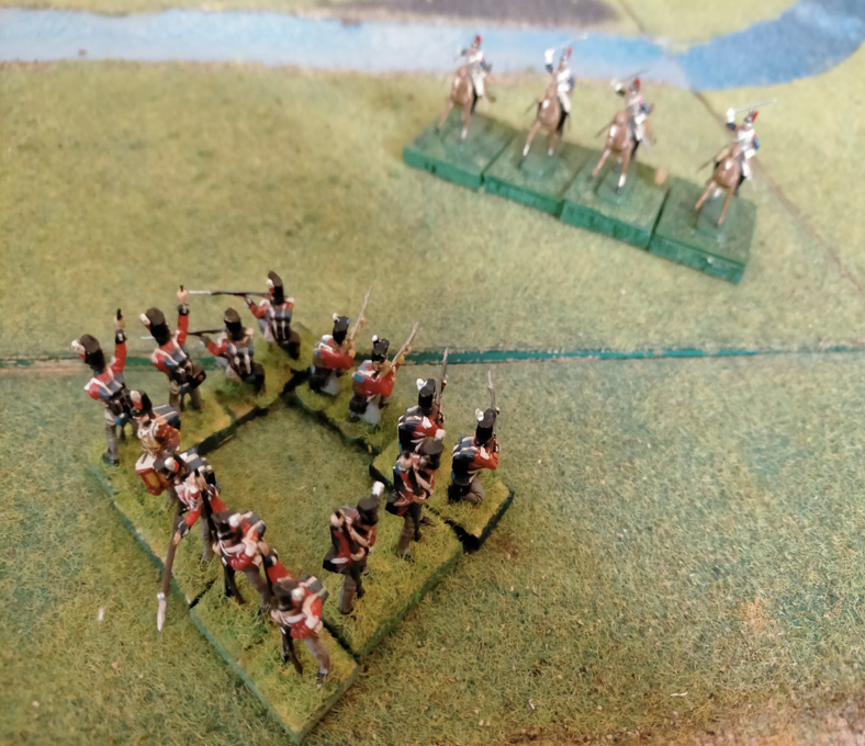The best tactical disposition to defend against cavalry is the square. It makes it impossible for the cavalry to get around and very difficult to break through. The first line is formed by soldiers on their knees with bayonets attached and this creates an insurmountable wall for horses. Cavalry, on the other hand, has little to fear, except for the possible fire of a very small second line. The cavalry, both in line and in column, can attack a square with no more than one unit.To break the square, the Cavalry must throw three dice and simultaneously get three numbers higher than the reactivity index. In the example above, the outcomes of the dice are: 5, 6 and 5. The cavalry break the square. It then eliminates eight enemy soldiers.